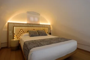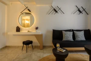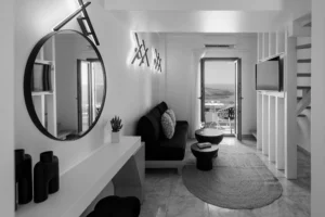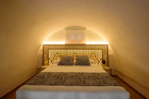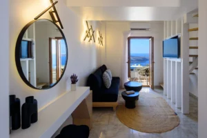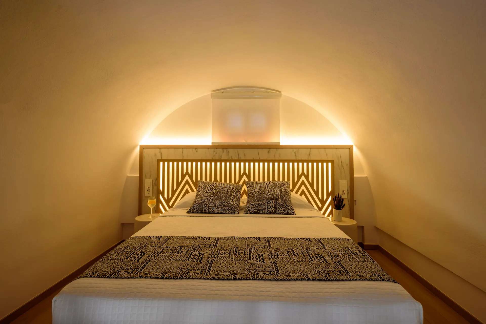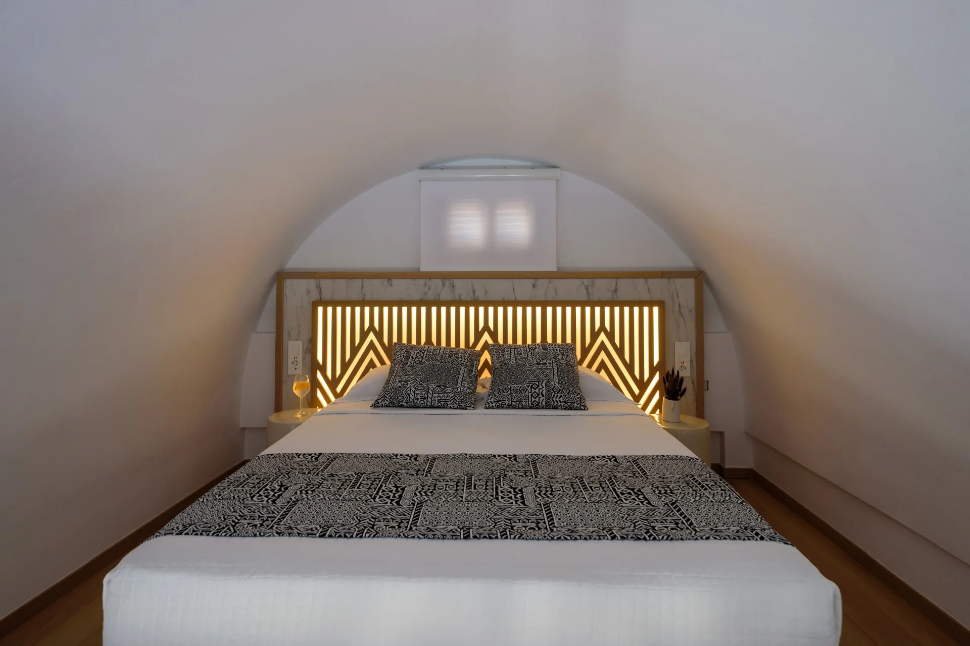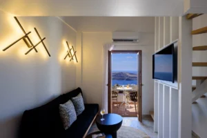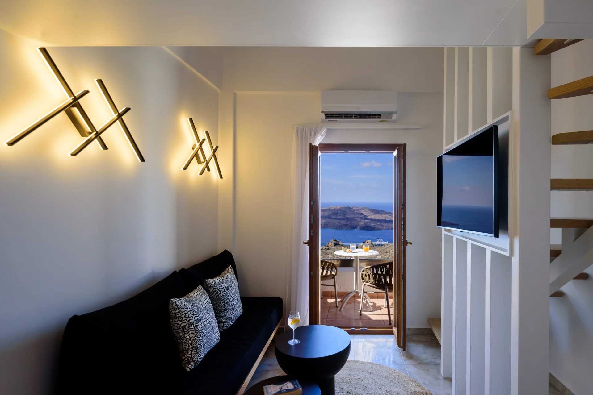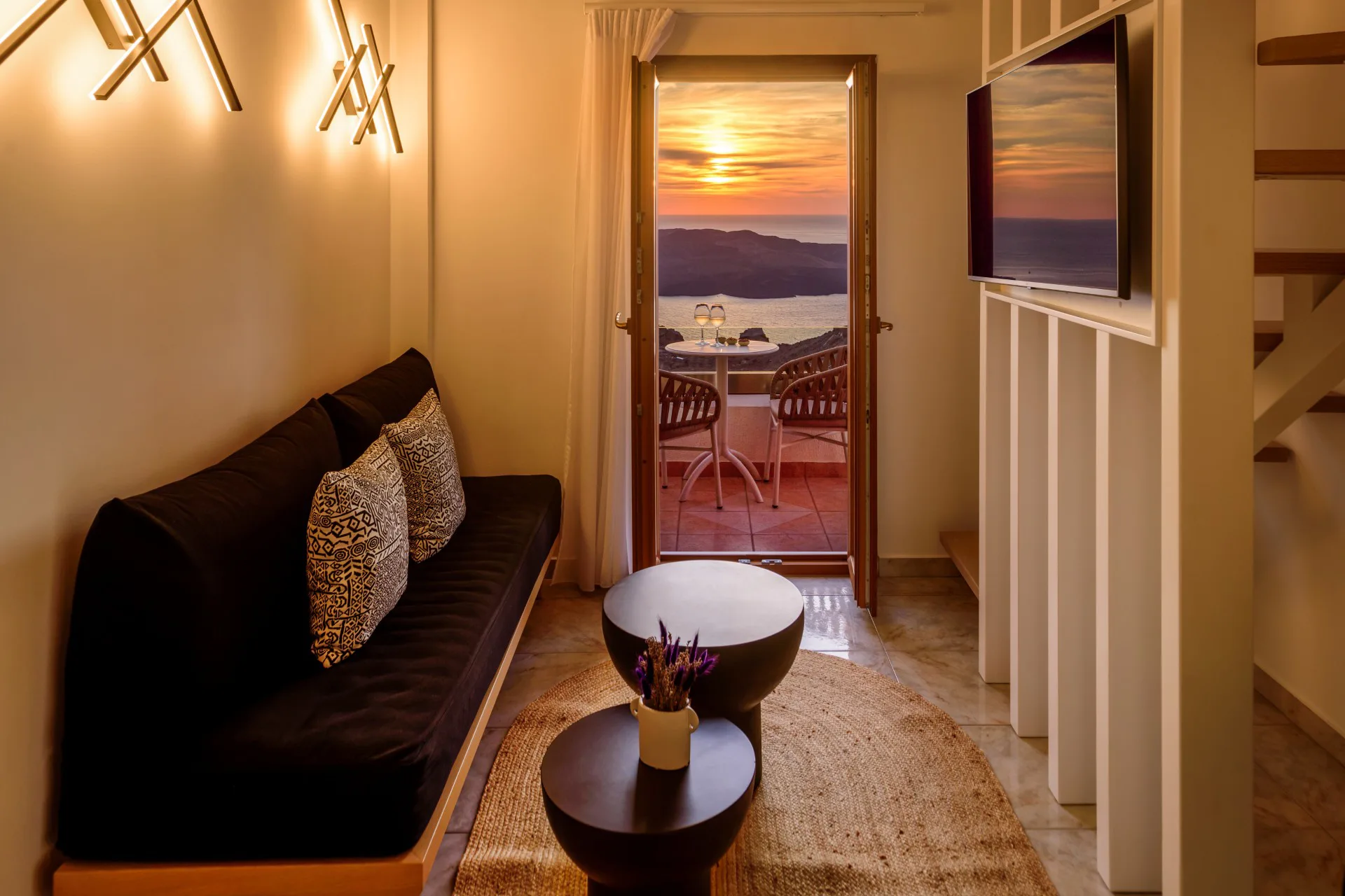 These Maisonettes offer a serene escape with breathtaking views over the volcano and the sea. This elegant room boasts interior steps that lead to the bedroom with one queen size bed, blending modern amenities with traditional Cycladic charm. Guests can indulge in the tranquil atmosphere, watching the sunset from the private balcony.