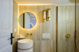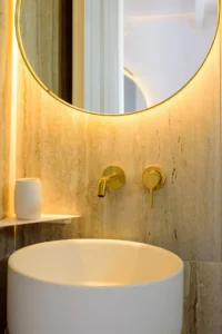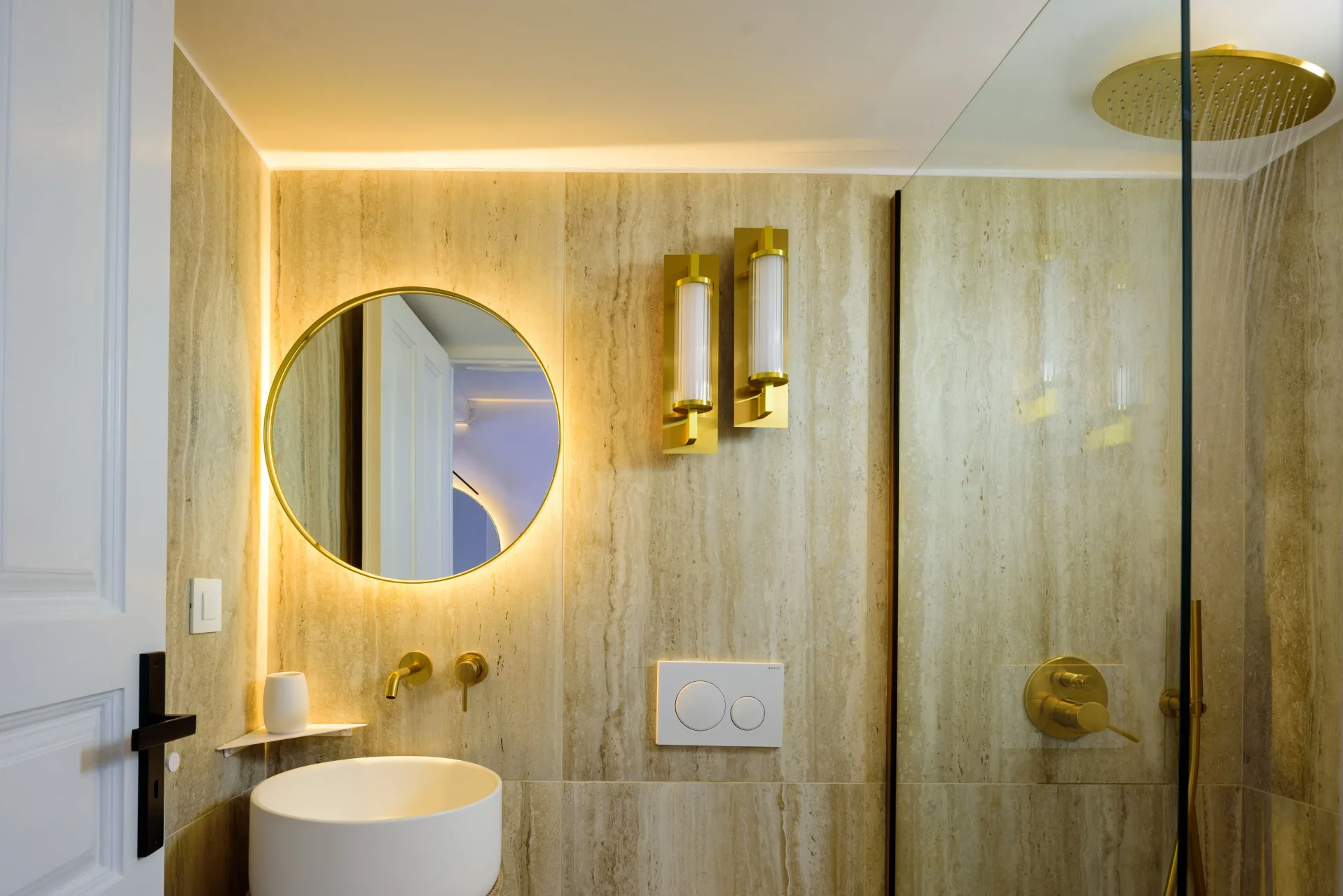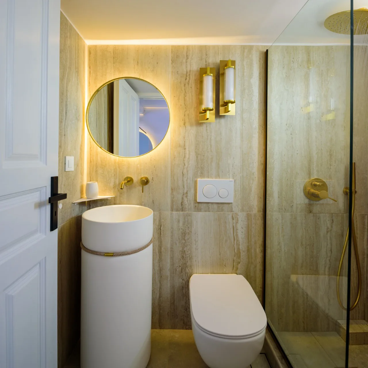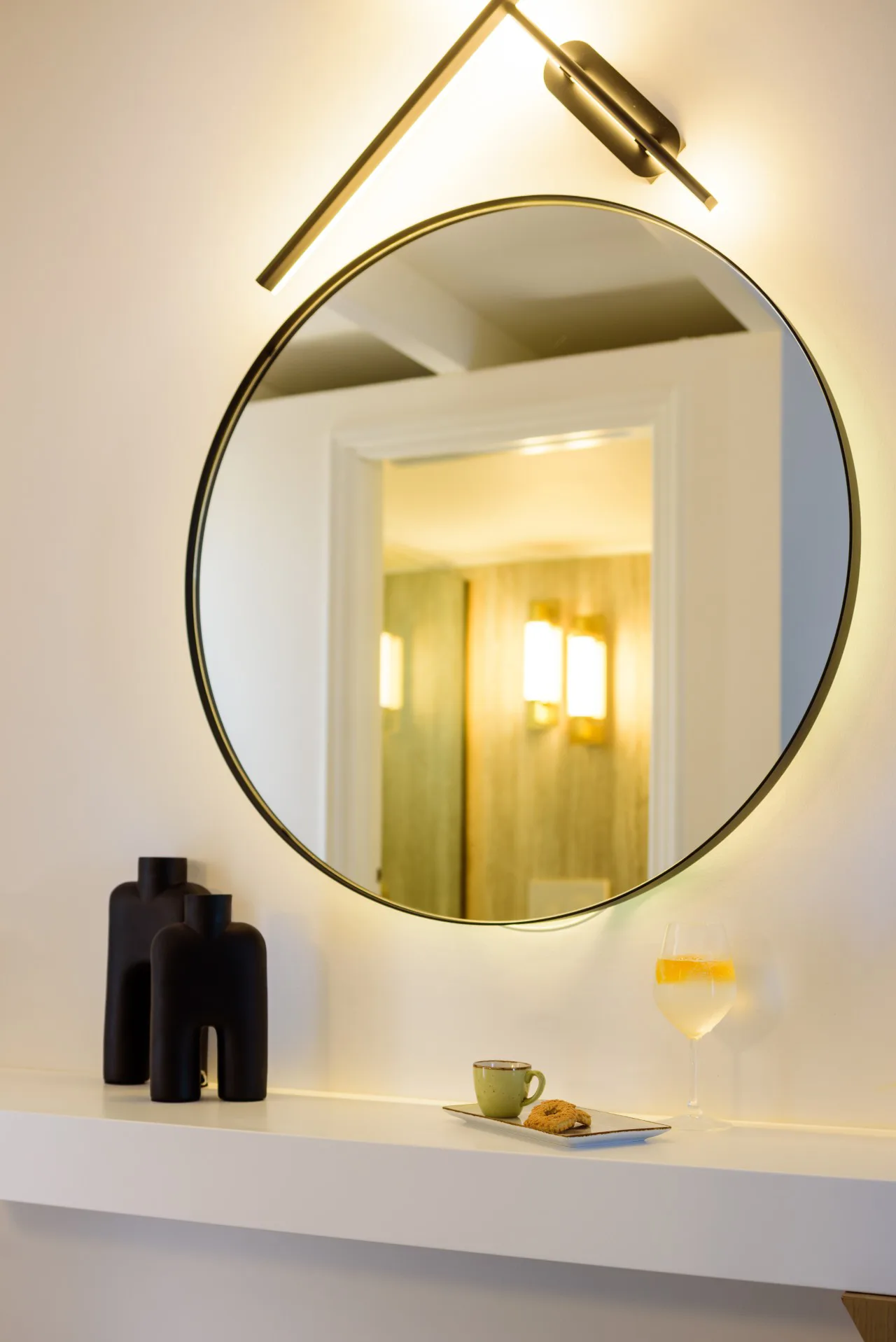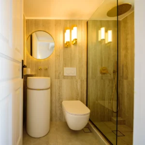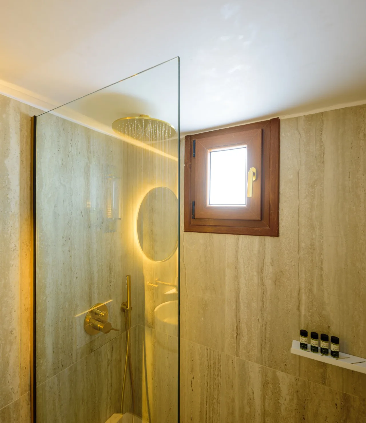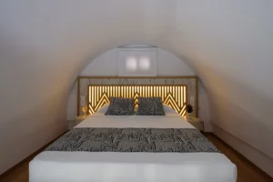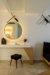 These Maisonettes offer a serene escape with breathtaking views over the volcano and the sea. This elegant room boasts interior steps that lead to the bedroom with one queen size bed, blending modern amenities with traditional Cycladic charm. Guests can indulge in the tranquil atmosphere, watching the sunset from the private balcony.